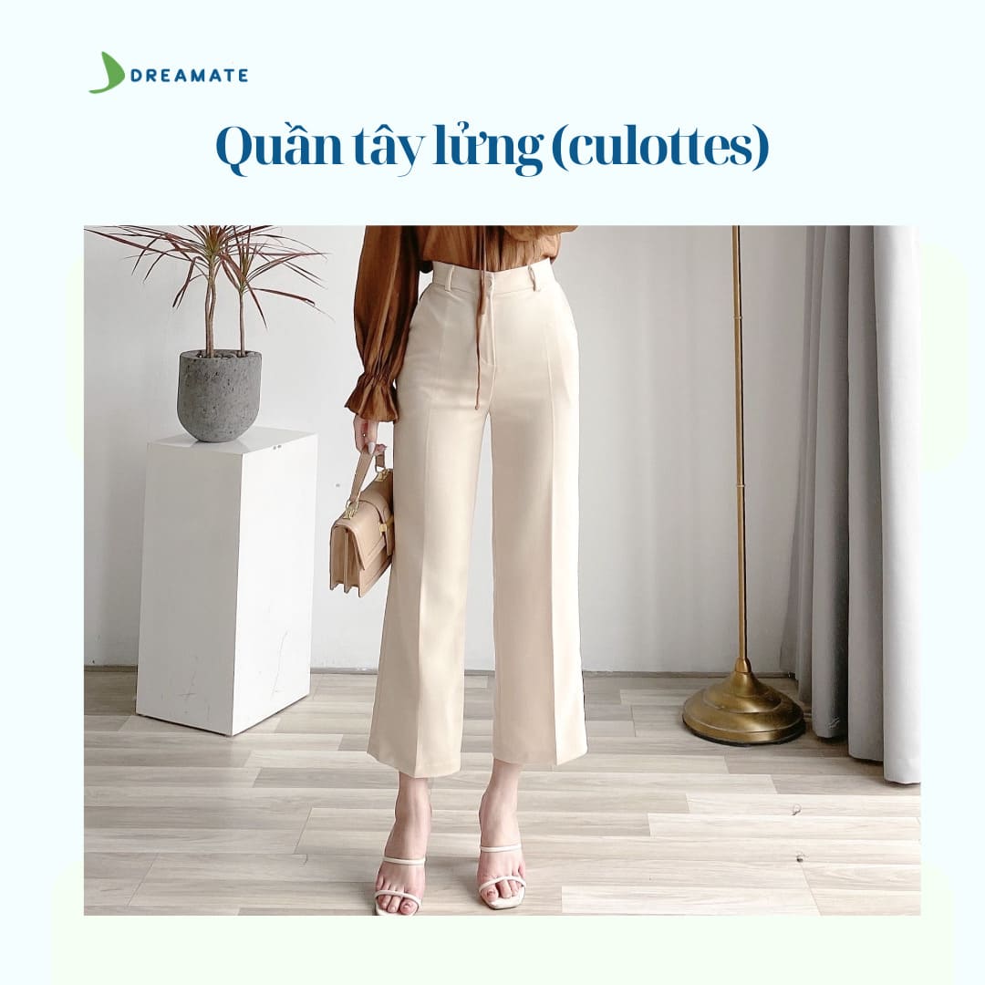 Quần tây lửng (culottes): Đây là mẫu quần có chiều dài đến giữa bắp chân hoặc mắt cá, giúp tạo sự thoải mái và phong cách thời trang. Quần tây lửng phù hợp cho môi trường làm việc không quá nghiêm ngặt về trang phục.
