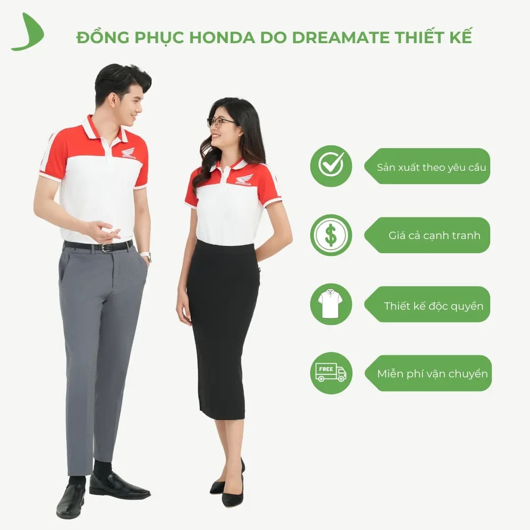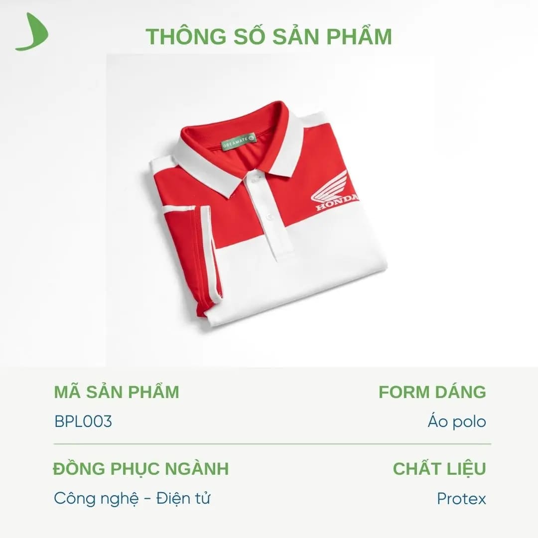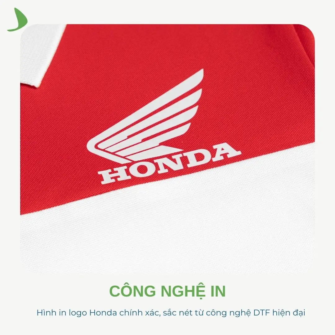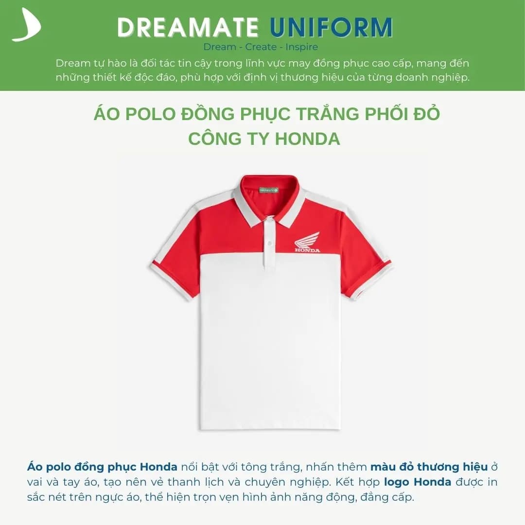 Áo polo đồng phục Honda nổi bật với tông màu trắng chủ đạo kết hợp điểm nhấn đỏ ở vai và tay áo, tạo nên vẻ thanh lịch và chuyên nghiệp. Thiết kế tinh tế với cổ trắng cùng logo sắc nét được in trên ngực áo, thể hiện trọn vẹn hình ảnh năng động và đẳng cấp cửa Honda.