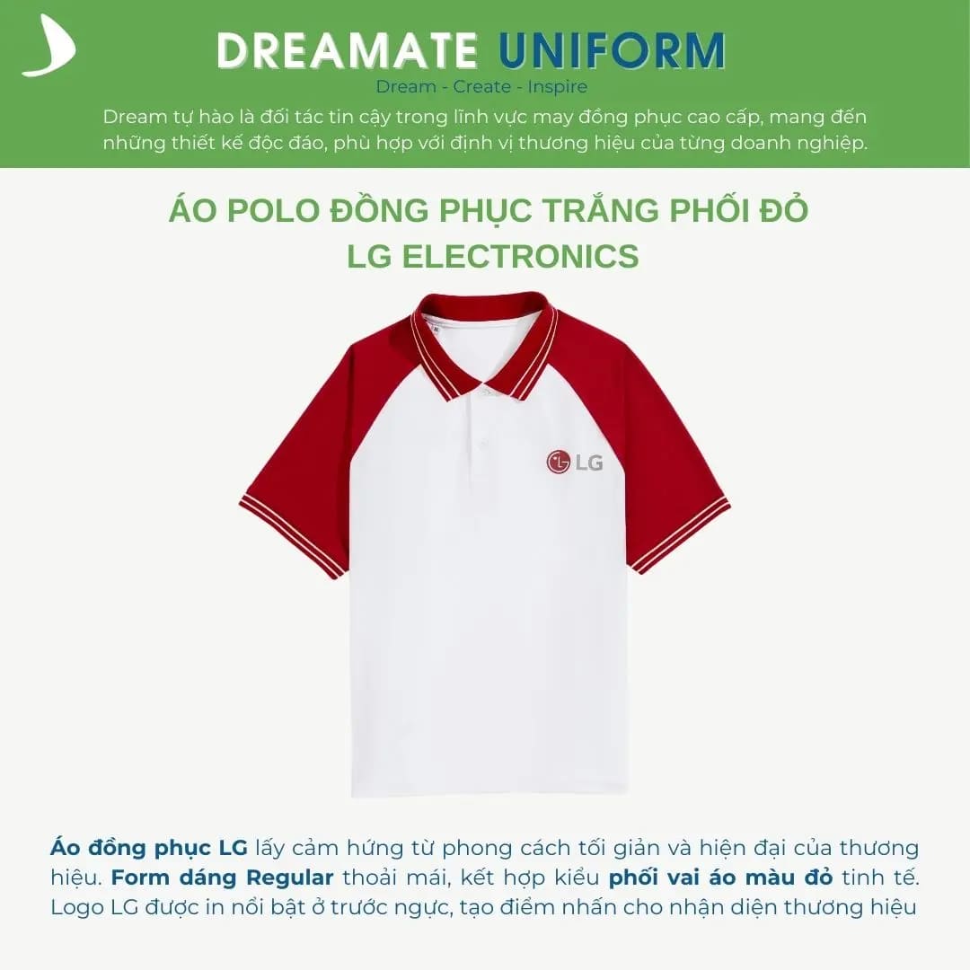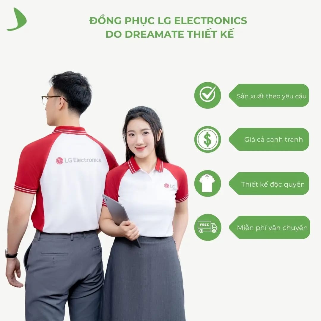 Đồng phục LG lấy cảm hứng từ phong cách tối giản và hiện đại của thương hiệu. Form dáng regular đảm bảo sự thoải mái, kết hợp phối vai áo cùng màu tinh tế. Logo LG được in nổi bật ở ngực, tạo điểm nhấn cho nhận diện thương hiệu.