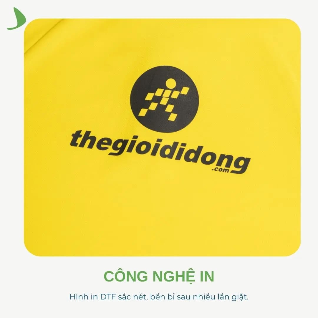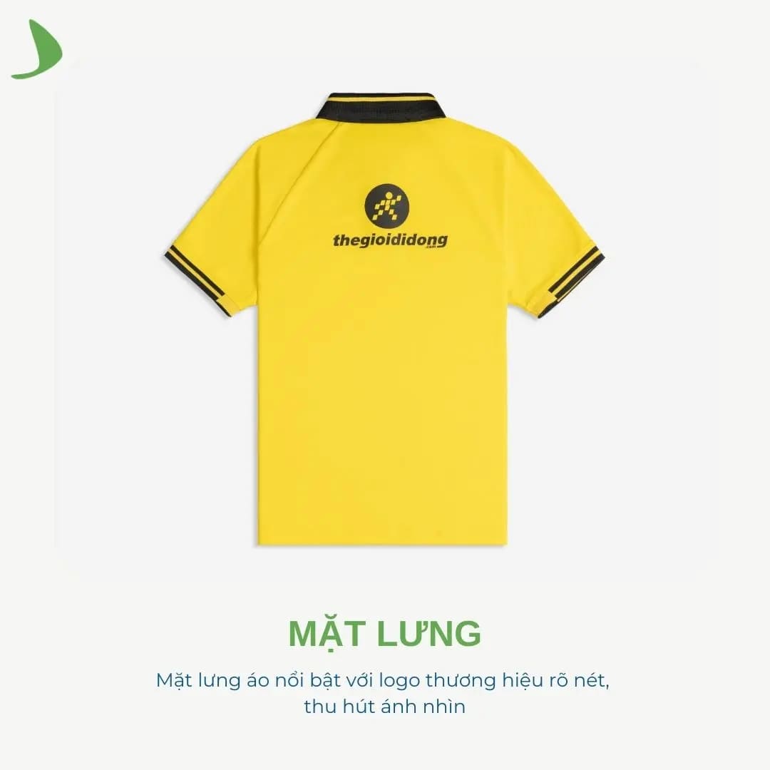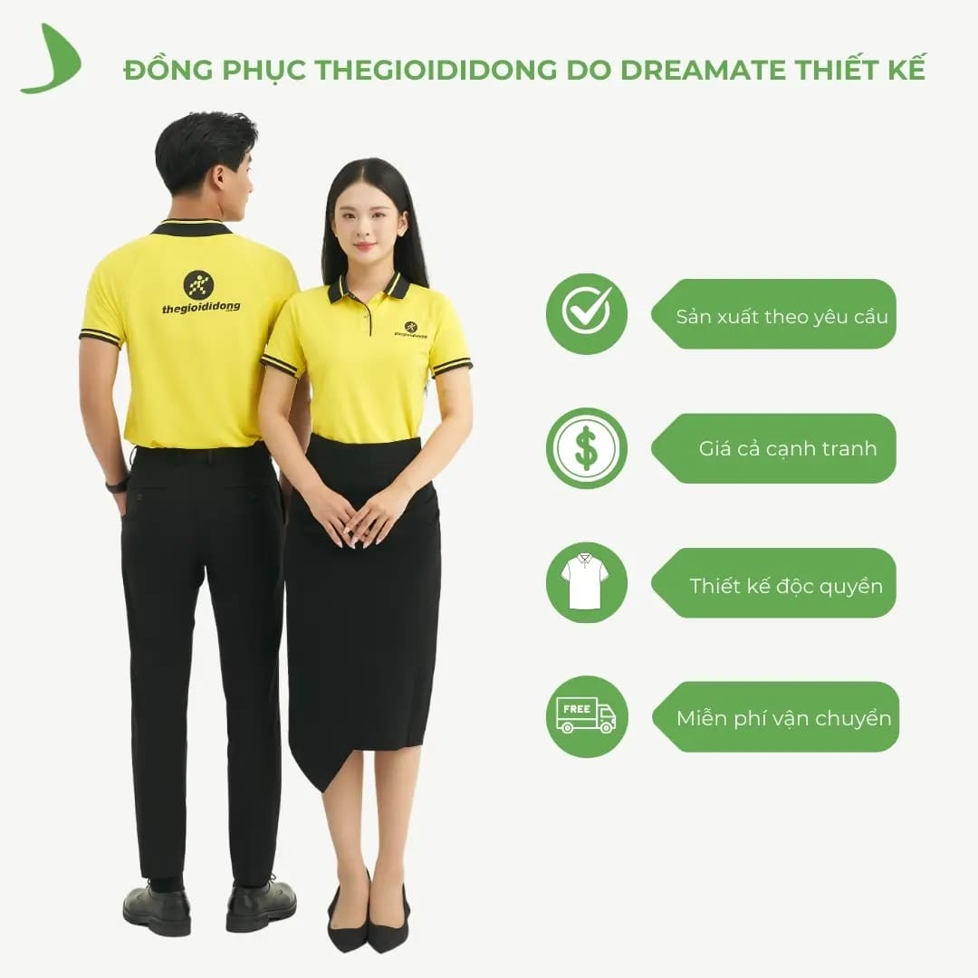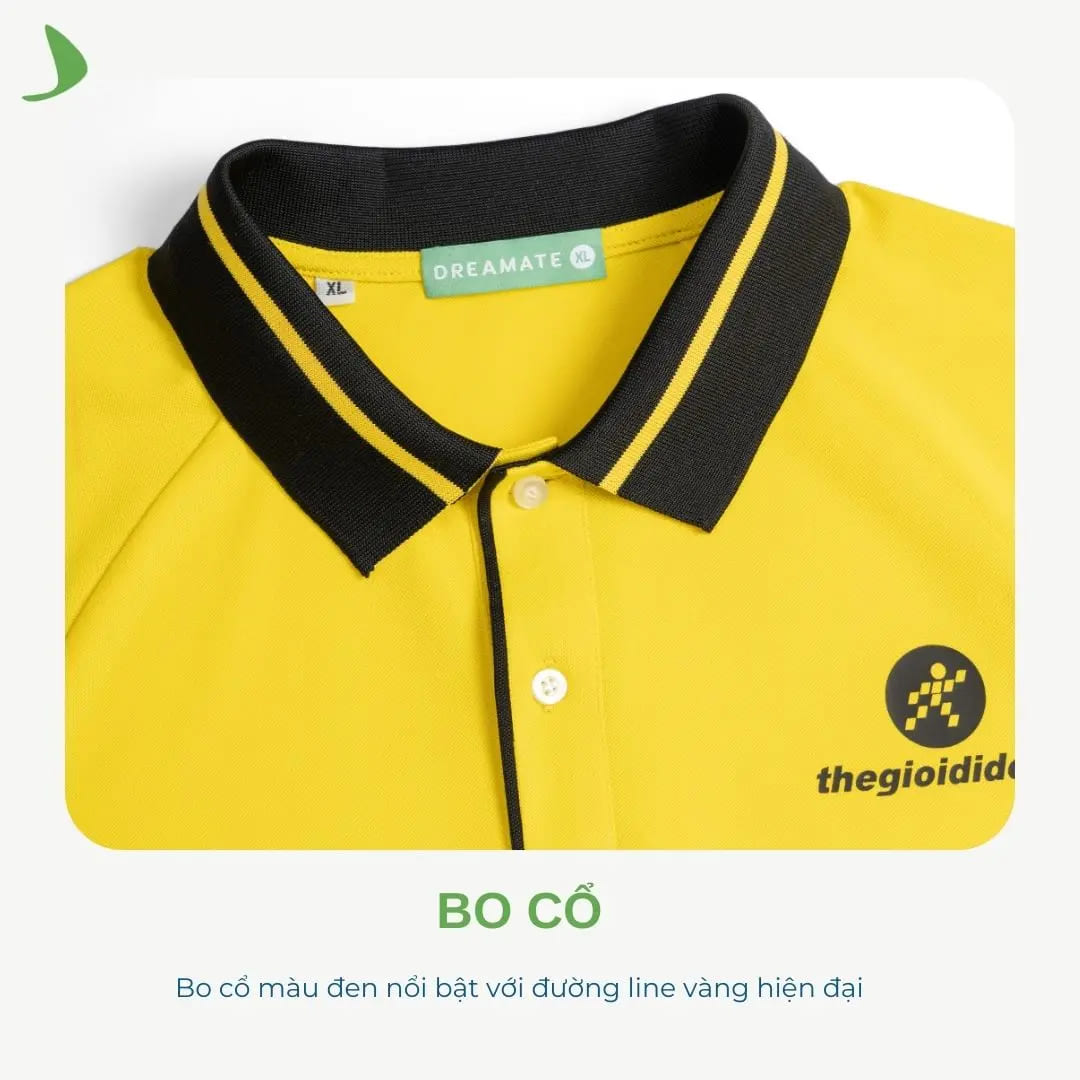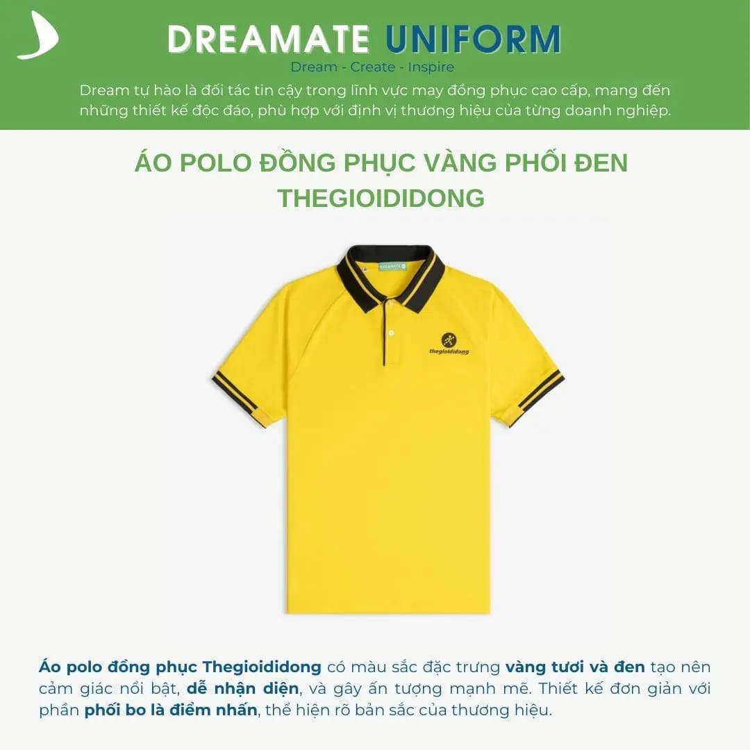 Tại Dreamate, áo polo đồng phục Thegioididong có màu sắc đặc trưng vàng tươi và đen tạo nên cảm giác nổi bật, dễ nhận diện, và gây ấn tượng mạnh mẽ. Thiết kế đơn giản và phân phối bo là điểm nhấn, thể hiện rõ bản sắc của thương hiệu.