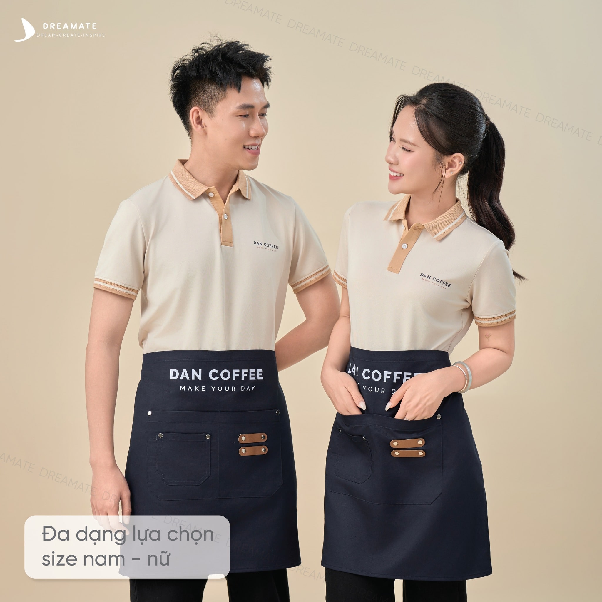 Kết hợp cùng áo là tạp dề ngắn màu xám thanh lịch, gọn gàng, tiện lợi khi di chuyển trong không gian quán đông khách. Tên thương hiệu được thêu chỉ trắng tinh tế trên mặt trước tạp dề, làm tăng tính nhận diện. Chất liệu Duramax bền chắc, chống thấm, chống bụi, dễ vệ sinh, giữ cho tạp dề luôn sạch sẽ và đứng form, góp phần hoàn thiện hình ảnh chỉn chu, chuyên nghiệp cho đội ngũ nhân viên Pizza 4P'S.