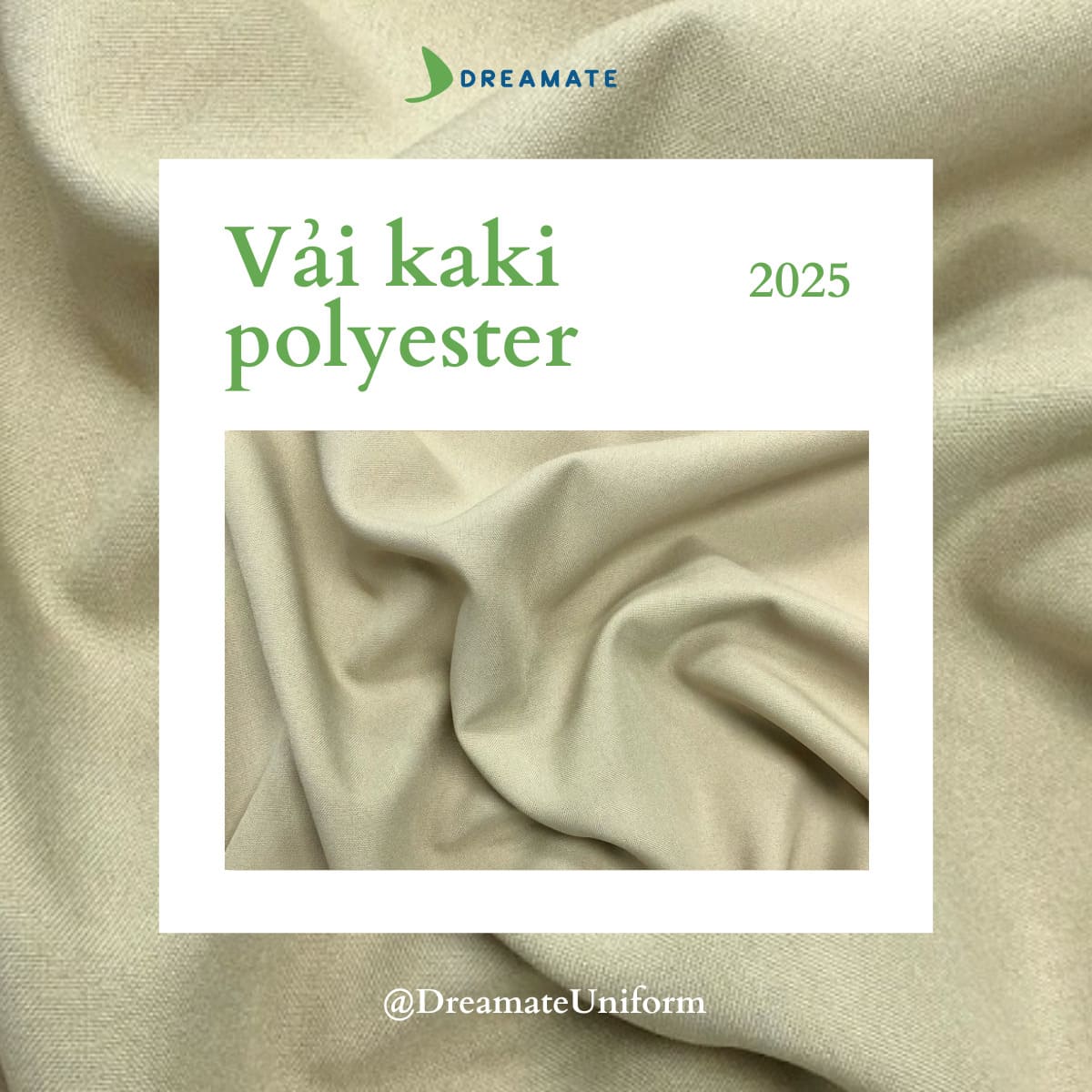Kaki Polyester được tạo ra từ sợi polyester nhân tạo, giúp vải có độ bền cao, ít nhăn và giữ form tốt hơn so với kaki cotton. Ngoài ra, vải kaki polyester còn có khả năng chịu nhiệt tốt, giúp hạn chế tình trạng co rút sau khi giặt. Vì những ưu điểm này, loại vải này thường được sử dụng để may đồng phục bảo hộ lao động hoặc trang phục yêu cầu độ bền cao. Tuy nhiên, do thành phần sợi tổng hợp, vải kaki polyester có độ thoáng khí kém hơn so với kaki cotton.